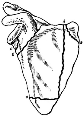 Переломи лопатки виникають у результаті безпосереднього впливу сили на плече або лопатку, а також у разі падіння на лікоть при відведеній руці. В останньому випадку сила удару передається на суглобову поверхню шийки лопатки і відбувається порушення її цілості. Перелом може бути в будь-якому місці, у зв'язку з чим розрізняють: 1) переломи суглобової западини; 2) переломи шийки; 3) переломи акроміального і клювовидного відростків; 4) переломи тіла лопатки в різних варіантах (рис. 28).