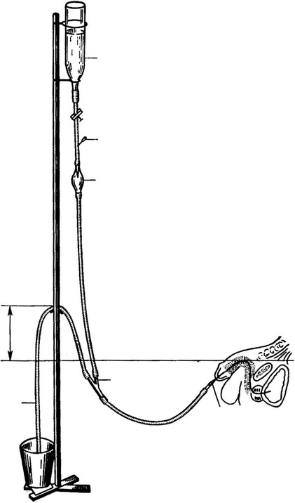 Антисептичний розчин з резервуара (рис. 56) по гумовій трубці через крапельницю, трійник і катетер потрапляє в сечовий міхур. Швидкість проходження розчину - 5-6 крапель в хвилину. Коли сечовий міхур повністю заповнений розчином, трубка, що йде з резервуара, піднімається, а зливний коліно трубки, яке знаходилося вище рівня сечового міхура, опускається на 10-15 см і рідина з сечового міхура через трійник і трубку витікає у встановлений заздалегідь посудину. Моченой міхур промивають 5-6 разів на добу розчином риванолу (1 : 1000), фурациліну (1 : 5000), антибіотиків та ін