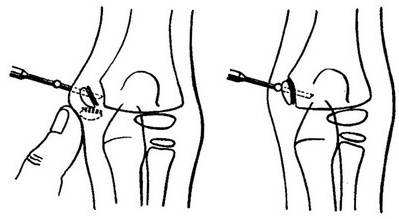 Рис. 39. Вправлення і фіксація внутрішнього надвиростка голкою по Баирову.