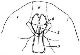 ![]() Рис. 1. Чоловіча промежину і суміжні з нею області: 1 - reg. glutea; 2 - reg. pudendalis (BNA); 3 - reg. urogenitalis (BNA); 4 - reg. perinealis (BNA); 5 - reg. analis; 6 - reg. sacralis. |