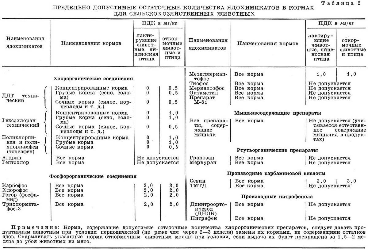 Категорично забороняється обробка молочного і забійної худоби препаратами ДДТ, гексахлорану та іншими такого ж роду сільськогосподарськими пестицидами, здатними накопичуватися в організмі й виділятися з молоком тварин. Випас молочного і забійної худоби на полях і луках, оброблених препаратами ДДТ, гексахлорану, гептахлора, полихлорпинена та іншими стійкими агрохімікатами, а також згодовування худобі бадилля картоплі і буряків, оброблених зазначеними отрутохімікатами, до закінчення терміну регламентації застосування цих отрут заборонений. Гранично допустимі залишкові кількості пестицидів у кормах для сільськогосподарських тварин - див. табл. 2.