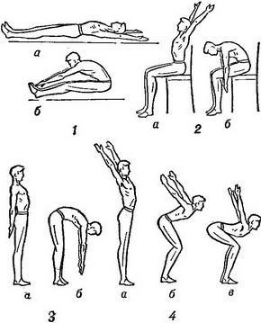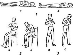 ![]() Рис. 2. Статичні дихальні вправи, виконувані в положеннях лежачи (1), сидячи (2), стоячи (3): а - вдих; б - видих. Рис. 3 (праворуч). Динамічні дихальні вправи, що виконуються в положенні лежачи (1), сидячи (2), стоячи (3 і 4): а - вдих; б - видих. |