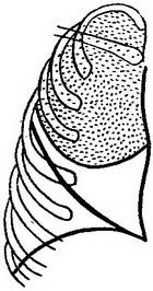 ![]() Рис. 1. Правобічна верхнедолевая крупозна пневмонія (схема з рентгенограми в передньому положенні). |