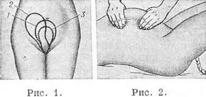 ![]() Рис. 1. Зміна форми і положення матки: 1 - після народження плоду; 2 - після відділення плаценти; 3 - після народження посліду. Рис. 2. Виділення посліду за Абуладзе. |
