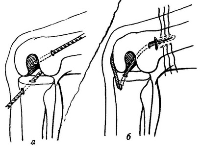 При розриви хрестоподібних зв'язок запропоновано ряд операцій, суть яких полягає у відновленні зв'язок за допомогою смужки; широкої фасції стегна (рис. 5), лавсану, капронової стрічки та ін.