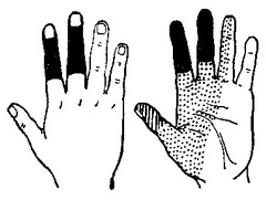 Рис. 3. Розлад чутливості при повному розриві серединного нерва. Чорним позначено повна втрата всіх видів чутливості, штриховкою і крапками - гипальгезия і терманестезия.