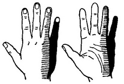 Рис. 5. Розлад чутливості при повному розриві ліктьового нерва. Чорним позначено повна анестезія всіх видів чутливості, заштриховані ділянки - гипальгезия і терманестезия. |