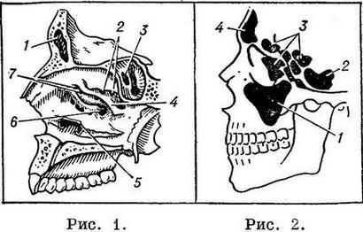 Анатомія. З кожної сторони до порожнини носа примикають верхньощелепна (щелепна), або гайморова, пазуха, лобова пазуха, гратчастий лабіринт і частково основна пазуха.