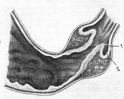 ![]() Рис. 1. Поздовжній розріз через сторож при пілоростенозі (за Ладду і Гроссу): 1 - «шпора», утворена випинанням воротаря в просвіт дванадцятипалої кишки; 2 - кишеня слизової оболонки. |