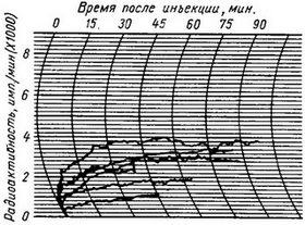 Іноді за допомогою третього датчика простежують за надходженням препарату через жовчні шляхи до кишечнику. У здорових людей час очищення крові від фарби наполовину (Т 1/2 кліренсу) дорівнює 8 хв. протягом першої хвилини після введення фарби спостерігають різке наростання рівня радіоактивності над П., що характеризує стан її судинного русла. Подальший більш повільний підйом кривої (гепатограммы) відображає поглинання фарби з крові полігональними клітинами П. Максимум поглинання на гепатограмме в нормі (за даними деяких авторів) наступає на 20-30-й хв. (рис. 20). Час виведення половини кількості фарби з П. в жовчний міхур коливається між 60-115 хв.; через 24 години в П. залишається не більше 2,5% введеного препарату.