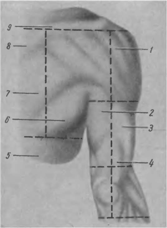 ![]() Рис. 2. Шкірні розрізи при препаруванні лопаткової, дельтоподібного, задній плеча і задній ліктьовий областей. 1 - m. deltoideus; 2 - m. triceps brachii (caput longum); 3 - m. triceps brachii (caput laterale); 4 - m. triceps brachii (tendo); 5-m. latissimus dorsi; 6 - m. teres major; 7 - m. infraspinatus; S - m. trapezius; 9 - spina scapulae. |