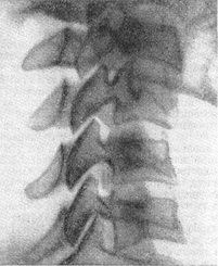 ![]() Рис. 30. Різко виражені дегенеративні зміни в шийному відділі: артроз, остеохондроз (функціональна рентгенографія; знімок в положенні розгинання, зміщення лестницеобразного типу мало помітно). |