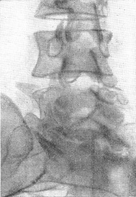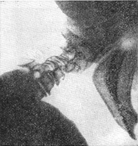 ![]() Рис. 31. То ж спостереження, що і на рис. 30. Знімок в положенні згинання вперед. Чітко видно зміщення II і III хребців. |