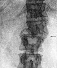 ![]() Рис. 33. Переломовивих I поперекового хребця в стадії консолідації. Розрив диска і перелом правого нижнього суглобового відростка I поперекового хребця, вивих I поперекового хребця зі зміщенням вправо, утворення кісткової мозолі (вказано стрілкою). |