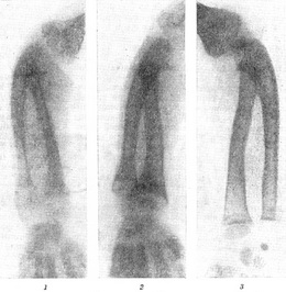 Рис. 7. Передпліччя дитини 1 р. 8 міс., хворого важким рахітом: 1 - остеопороз, зони перебудови Лоозера, заміщення зон росту остеоидом; 2 - той самий випадок через 5 міс., рахіт у фазі репарації; 3 - той самий випадок ще через 8 міс., подальше відновлення зон росту та структури кісток, остеопороз. |