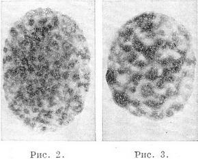 ![]() Рис. 2. Ядро, яке не містить статевий хроматин (зішкріб зі слизової оболонки порожнини рота здорового чоловіка). Рис. 3. Ядро, що містить подвійний статевий хроматин (зішкріб зі слизової оболонки порожнини рота хворої трисомією X). |