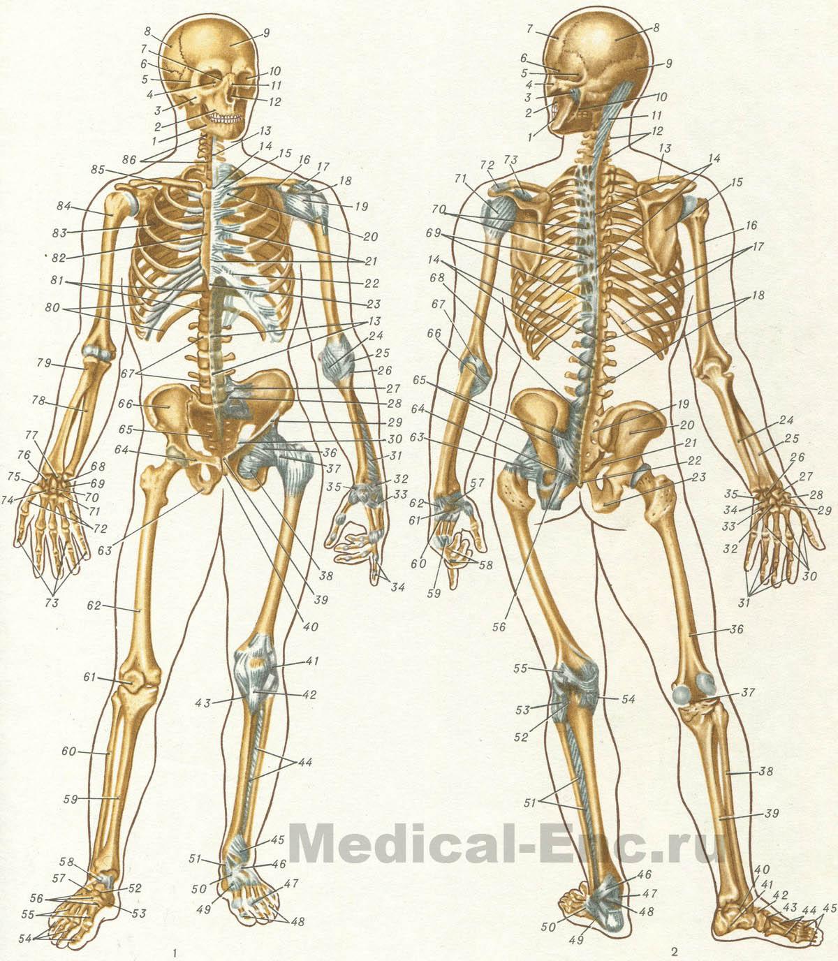 1 - нижня щелепа; 2 - верхня щелепа; 3 - вилична кістка; 4 - решітчаста кістка; 5 - клиноподібна кістка; в - скронева кістка; 7 - слізна кістка; 8 - тім'яна кістка; 9-лобова кістка; 10 - очна ямка; 11 - носова кістка; 12 - грушоподібної отвір; 13 - передня поздовжня зв'язка; 14 - межключичная зв'язка; 15 - передня грудинно-ключична зв'язка; 16 - клюво-ключична зв'язка; 17 - акроміально-ключична зв'язка; 18 - клювоакромиальная зв'язка; 19 - клювоплечовий зв'язка; 20 - реберно-ключична зв'язка; 21 - променисті грудинно-реберні зв'язки; 22 - зовнішня міжреберна перетинка; 23 - реберно-мечоподібного зв'язка; 24 - ліктьова бічна зв'язка; 25 - променева окольная (бічна) зв'язка; 26 - кільцева зв'язка променевої кістки; 27 - клубово-поперекова зв'язка; 28 - вентральні (черевні) крижово-клубові зв'язки; 29 - пахова зв'язка; 30 - крижово-остиста зв'язка; 31 - міжкісткова перетинка передпліччя; 32 - дорсальні межзапястные зв'язки; 33 - дорсальні п'ясткові зв'язки; 34 - обхідні (бічні) зв'язки; 35 - променева окольная (бічна) зв'язка зап'ястка; 36 - лобково-стегнова зв'язка; 37 - клубово-стегнова зв'язка; 38 - запирательная перетинка; 39 - верхня лобкова зв'язка; 40 - дугоподібна зв'язка лобка; 41 - малогомілкова окольная (бічна) зв'язка; 42 - зв'язка наколінка; 43 - великогомілкова окольная (бічна) зв'язка; 44 - міжкісткова перетинка гомілки; 45 - передня большеберцово-малогомілкова зв'язка; 46 - роздвоєна зв'язка; 47 - глибока поперечна плюсневая зв'язка; 48 - обхідні (бічні) зв'язки; 49 - тильні зв'язки плесна; 50 - дорсальні зв'язки плесна; 51 - медіальна (дельтовидні) зв'язка; 52 - човноподібна кістка; 53 - п'яткова кістка; 54 - кістки пальців стопи; 55 - плеснові кістки; 56 - клиновидні кістки; 57 - кубовидна кістка; 58 - таранна кістка; 59 - великогомілкова кістка; 60 - малогомілкова кістка; 61 - надколінок; 62 - стегнова кістка; 63 - сіднична кістка; 64 - лобкова кістка; 65 - крижі; 66 - клубова кістка; 67 - поперекові хребці; 68 - гороховидна; 69 - тригранна кістка; 70 - головчаста кістка; 71 - крючковатая кістка; 72 - п'ясткові кістки; 7 3-кістки пальців кисті; 74 - трапецієподібна кістка; 75 - кістка-трапеція; 76 - човноподібна кістка; 77 - півмісяцева кістка; 78 - ліктьова кістка; 79 - променева кістка; 80 - ребра; 81 - грудні хребці; 82 - грудина; 83 - лопатка; 84 - плечова кістка; 85 - ключиця; 86 - шийні хребці.