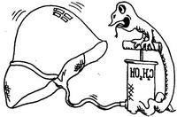 Обмін алкоголю в печінці здійснюється кількома ферментними системами, з яких основну роль відіграє система алкогольної дегідрогенази (АДГ) в цитозолі печінкової клітини. Наявність АДГ в печінці людини пояснюється тим, що невеликі кількості алкоголю виробляються в нормальних умовах бактеріями тонкої кишки. Розпад алкоголю в печінці проходить через кілька етапів (рис. 17). Спочатку під впливом АДГ етанол окислюється до також вельми токсичного проміжного продукту - ацеталь - дегида з вивільненням водню. Коферментом цієї реакції є НАД. Приєднуючи отщепившийся від молекули етанолу водень, НАД відновлюється в НАДН (відновлений НАД):
