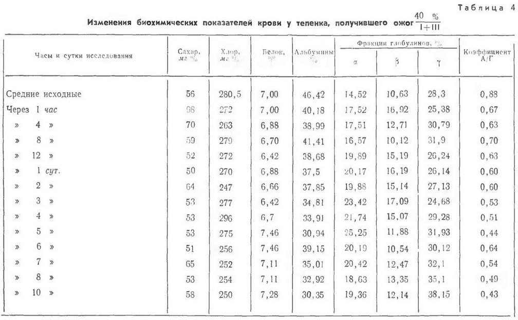 Р. В. Панкратов в експерименті встановив, що при великих опіках в крові свиней і великої рогатої худоби вже з першої години прогресивно падає кількість білка і збільшується вміст залишкового азоту. При цьому найбільш різкі зміни виявляються у фракційному складі білків крові - прогресивно зменшується вміст альбумінів і збільшується вміст глобулінів. Збільшення кількості глобулінової фракції в перші 3 - 4 дні йде в основному за рахунок альфа - і бета-глобулінів, а в подальшому - за рахунок гамма-глобулінів.