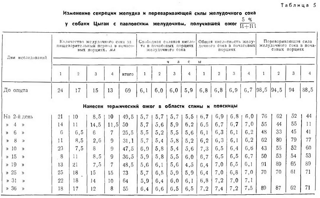 У таблиці 5 наводяться дані шлункової секреції собаки Циган, яка за 25 днів до опіку була оперована - зроблений павловський шлуночок.