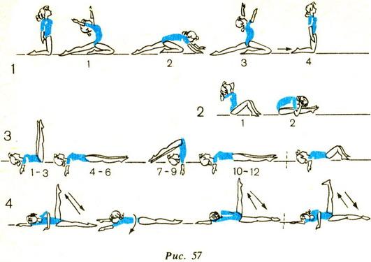 1. І.п. - стоячи на колінах, руки вздовж тулуба. Відвести ліву ногу далеко назад, сідаючи при цьому на праву п'яту, руки підняти вгору (долоні всередину). Прогнутися, голову назад (подивитися вгору), розслаблено нахилитися вперед, голова на одній прямій з тулубом. Випрямитися, голову назад (подивитися вгору). Приставити ліву ногу, повернутися в и.п. Те ж іншою ногою. Повторити 20 разів.