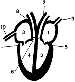 1 - ліве передсердя; 2 - лівий шлуночок; 3 - праве передсердя; 4 - правий шлуночок; 5 - стулкові клапани; 6 - півмісяцеві клапани; 7 - аорта; 8 - легенева артерія; 9 - легеневі вени; 10 - вени великого кола кровообігу