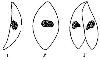1 - токсоплазма у стадії спокою; 2-3 - токсоплазма у стадії поділу.