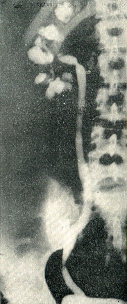 ![]() Рис. 85. Туберкульоз нирки і сечоводу. Сечовід вкорочений і натягнутий, фізіологічні вигини його зникли. Поликавернозный туберкульоз нирки. Ретроградна пиелоуретерограмма. |