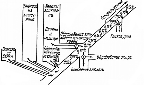 При нормальному рівні цукру в крові глюкоза або згорає і, отже, використовується на кінетичні потреби організму, або бере участь в утворенні жиру; при підвищенні кількості цукру в крові, наприклад, після прийому їжі, відбувається відкладання його в печінці і м'язах у вигляді глікогену, і, нарешті, якщо концентрація цукру досягає в крові 0,2%, рідше 0,15-0,16%, настає виділення глюкози з сечею - глюкозурія.