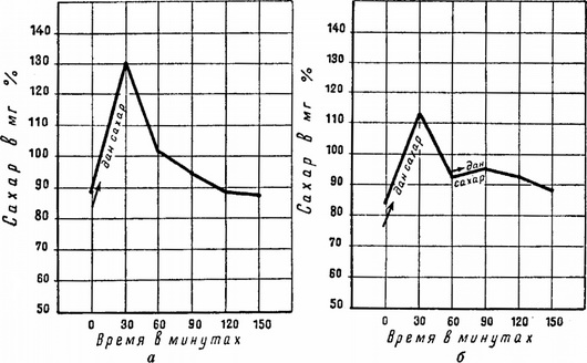 Висхідна частина глікемічний кривої, мабуть, частково відображає стан шлунково-кишкового тракту, зокрема всмоктування моносахаридів, і головним чином характеризує процес глікогенолізу. Спадний відрізок до деякої міри характеризує функцію гликогенообразования (рис. 43, а). При повторному навантаженні цукром при нормальному перебігу межуточных процесів вуглеводного обміну другого підйому, як правило, не буває (рис. 43, б). Звичайно, на глікемічний кривої відображається сукупність досить різноманітних моментів обміну речовин, а не тільки одних вуглеводів.