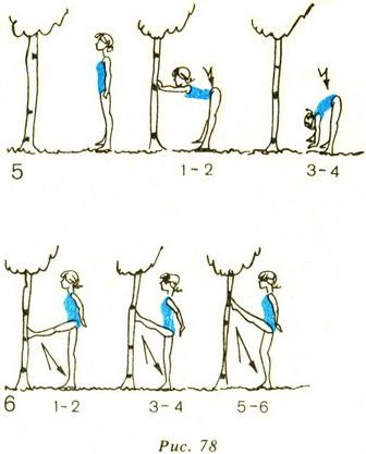 4. І. п. - стоячи лівим боком до дерева, ліва рука відведена в сторону і впирається в дерево, ліва уздовж тулуба. Нахил вліво, пружинящее рух правою рукою над головою, торкнувшись дерева. Повторити 8-10 разів. Те саме, стоячи правим боком до дерева.