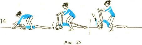 14. Дитина лежить, розслабившись, на спині з піднятими вгору руками. Мати встає, розставивши ноги, над дитиною, ногами стискає тулуб, бере його за зап'ястя і, злегка піднімаючи, виконує з дитиною (беруть участь пасивно) нахили поперемінно вправо і вліво. Потім підводить дитину і робить з ним пружні руху назад.