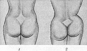 ![]() Рис. 2. Крижовий ромб: 1 - у жінки правильного статури; 2 - при деформованій тазі. |