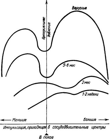 Те ж саме виходить у собак і, ймовірно, у людей. Поки ми побачили, що в кожному досліді на всіх тварин, теплокровних і холоднокровних, виходить так (!чи інакше двогорбий крива, причому у амфібій і болотних черепах вимикання імпульсації серцевих рецепторів, адресованій сосудорухомими центрам, веде до падіння тиску до нуля при працюючому серці.