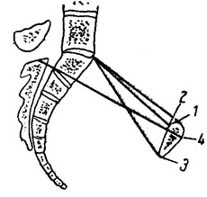 1 - анистомическая кон'югату; 2 - істинна (акушерська) кон'югату; 3 - діагональна кон'югата; 4 - зовнішня кон'югата.