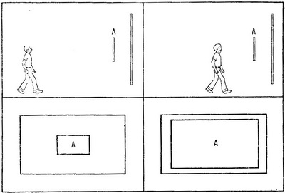 Іншим класичним джерелом інформації про віддаленості є оптичний градієнт розширення, який обговорювався вже в попередній главі. Всякий раз, коли ми рухаємося у напрямку до предмету (або предмет наближається до нас), його ретинальна зображення збільшується (рис. 4.7).