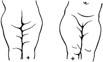Рис. 75. Асиметрія шкірних складок при вродженому вивиху стегна.