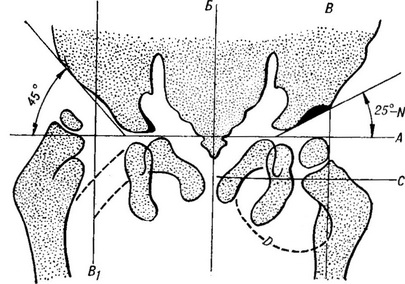 Рис. 76. Рання рентгенодіагностика вродженого вивиху стегна (пояснення в тексті).
