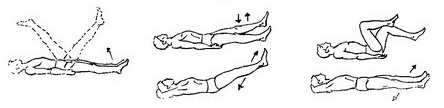 Розвиток м'язів ніг. Початкове положення: лягти на твердій поверхні без подушки, руки треба покласти разом під головою, при цьому м'язи стегон напружені до болю, ноги разом, витягнуті вперед під деяким кутом. Головне вправа робиться наступним чином: