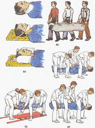 Якщо стан потерпілого виключає найменші рухи головою, кілька людей повинні підняти його і укласти на щит або широку дошку і фіксувати до неї пов'язкою за нижню щелепу або обкласти голову потерпілого поліетиленовими пакетами з піском, землею, водою. Піднімати потерпілого слід в абсолютно горизонтальному положенні, фіксуючи тіло руками в області шиї, спини, тазу, гомілок і стоп [95].