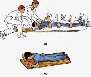 Якщо неможливо значно підняти потерпілого, необхідно підкласти під нього широку дошку [98]. При переломах в поперековому відділі хребта потерпілий може лежати на животі на жорсткій поверхні з валиком під грудьми [99].