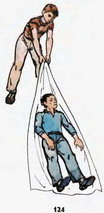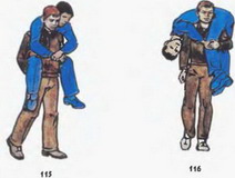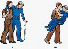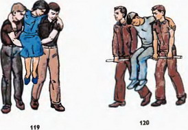 Потерпілого, що знаходиться в несвідомому стані, одному найбільш зручно транспортувати, утримуючи за передпліччя [121], удвох - переносити способом «один за одним» (якщо немає перелому хребта) [122].