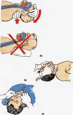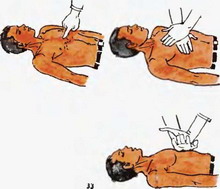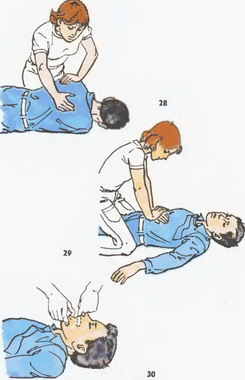Якщо спроба виявилася невдалою, застосовуйте удари в межлопаточную область у положенні потерпілого на боці [28], натиснення на верхню частину живота [29] або постарайтеся видалити чужорідне тіло пальцем [30]. До витягання чужорідного тіла, закупоривающего дихальні шляхи, штучна вентиляція легенів безглузда.