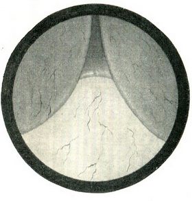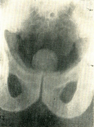 Рис. 119. Пневмоцистограмма; на тлі заповнює сечовий міхур кисню над лонним зчленуванням видно тінь аденоми передміхурової залози.