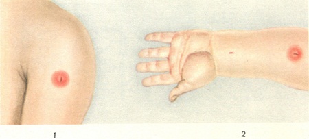 При реакції Пірке на шкіру середньої третини згинальної поверхні передпліччя наносять краплю нерозведеного туберкуліну Коха, а трохи нижче - краплю контрольного розчину (фізіологічний розчин з відповідним туберкуліну вмістом фенолу). Потім у місці розташування крапель скарифікують шкіру протягом 5 мм, не порушуючи при цьому кровоносних судин. Після всмоктування туберкуліну надлишок видаляють марлею. Інтенсивність реакції оцінюють через 48-72 год. за розміром папули, що виникла на місці нанесення туберкуліну (цветн. табл., рис. 2). Позитивна реакція Пірке вказує на інфікованість організму мікобактерією туберкульозу. У ранньому дитячому віці вона свідчить не тільки про присутність збудника, але і про клінічному захворюванні. Відносно низька чутливість реакції Пірке при негативних результатах робить необхідним постановку інший А. д. п. - реакції Манту, яка зазвичай доповнює пробу Пірке і здійснюється шляхом внутрішньошкірного введення 0,1 мл розведеного старого туберкуліну або його очищеної білкової фракції. Позитивним результатом вважається поява через 48-72 год. папули не менше 5 мм в діаметрі (цветн. табл., рис. 1). При постановці реакції Манту необхідно враховувати, що позитивна відповідь може бути у дітей, вакцинованих проти туберкульозу. Тільки стійко позитивні повторні реакції можуть вказувати на наявність туберкульозної інфекції.