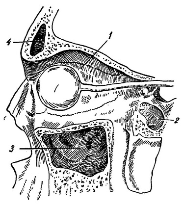 Рис. 1. Співвідношення очниці і придаткових порожнин носа. 1 - очноямкова пластинка; 2 - пазуха клиноподібної кістки; 3 - верхньощелепна (гайморова) пазуха; 4 - лобова пазуха.