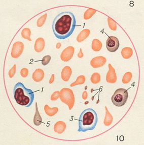 Рис. 10. Кров при анемії на грунті зловживання козячим молоком: 1 - лімфоцит; 2 - полихроматофильный еритроцит; 3 - нормобласт базихроматофильный; 4 - нормобласт полихроматофильный; 5 - пойкилоцит (еритроцит) полихроматофильный; 6 - кров'яні пластинки. Різко виражений пойкилоцитоз; анізоцитоз.