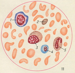 Рис. 11. Кров при анемії Якша - Гайема: 1 - базихроматофильный мегалобласт; 2 - полихроматофильный еритроцит; 3 - миелоцит нейтрофільний; 4 - полихроматофильный нормобласт; 5 - паличкоядерних нейтрофіл (1 класу). Пойкилоцитоз; анізоцитоз; олигохромемия.