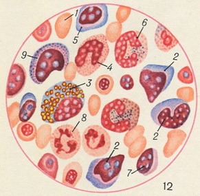 Рис. 12. Кістковий мозок при анемії Якша-Гайема: 1 - полихроматофильный нормобласт; 2 - макромиелобласт; 3 - промиелоцит еозинофільний; 4 - метамиелоцит нейтрофільний (юний нейтрофіл); 5 - микромиелобласт; 6 і 7 - метамиелоцит нейтрофільний; 8 - нейтрофіл сегментоядерный (2 і 3 класу); 9 - промиелоцит нейтрофільний.