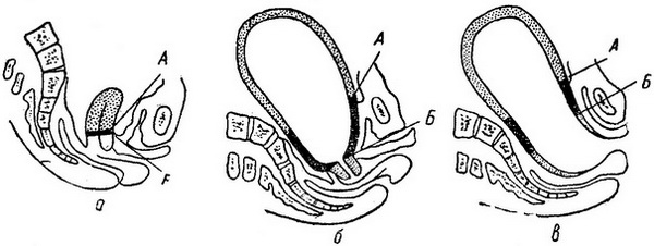 а - небеременная матка: А Б (чорна лінія) - перешийок, над ним - тіло матки, під ним - шийка; б - матка в кінці вагітності: АБ - сформований нижній сегмент (перешийок); в - матка в періоді вигнання. Перешийок (АБ) і шийка утворюють одну загальну вихідну трубку.